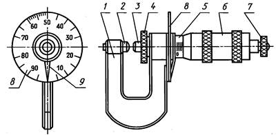 7 - трещотка (фрикцион); 8 - циферблат; 9 - стрелка