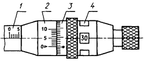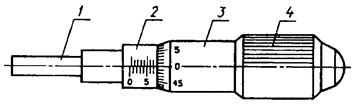 1 - микрометрический винт; 2 - стебель; 3 - барабан; 4 - трещотка (фрикцион)