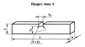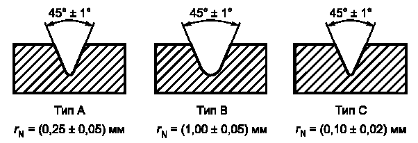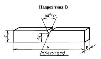 Надрез типа А должен иметь радиус закругления R не более 0,1 мм, типа В - (0,25 ± 0,01) мм.