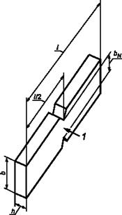 Если необходимо измерить влияние поверхностных эффектов для средне- и высокоударопрочных материалов, можно применять удар плашмя, используя образцы с двойным V-образным надрезом. Оба надреза перпендикулярны линии удара. Размер каждого надреза h - в соответствии с черт. 4.6.
