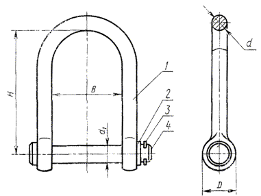 1 - скоба; 2 - шайба по ГОСТ 11371-78; 3 - шплинт по ГОСТ 397-79; 4 - штырь.