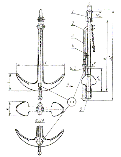 1 - скоба якорная по ГОСТ 765-85; 2 - якорь; 3 - шток с деталями; 4 - обух; 5 - подвесная скоба.