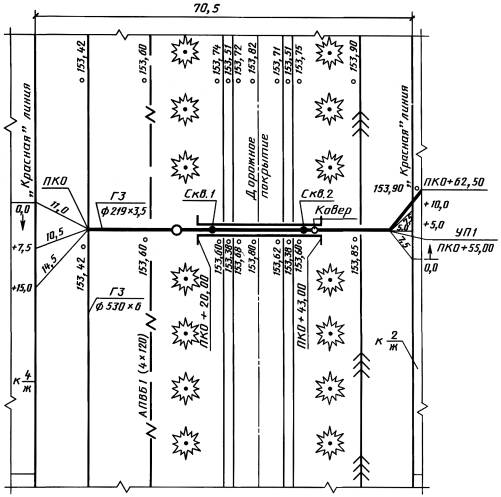 - пересекаемые автомобильные дороги, железнодорожные и трамвайные пути, кюветы, а также другие подземные и надземные сооружения в виде упрощенных контурных очертаний - сплошной тонкой линией, коммуникации, влияющие на прокладку проектируемых газопроводов, с указанием их габаритных размеров и высотных отметок;