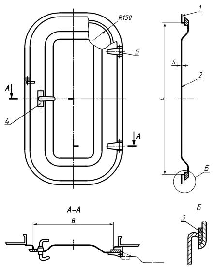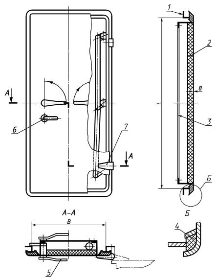 1 - рама; 2 - полотно; 3 - уплотнительная прокладка; 4 - замок с ручками-фалями; 5 - петля