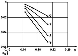 По результатам испытаний определяют также значения относительной просадочности εsl при различной конечной влажности ωз как разности абсцисс кривых εw = f(p) и кривой ε = f(p) грунта с природной влажностью. По полученным данным строят графики зависимости относительной просадочности εsl от влажности при определенных давлениях [см. рисунок Г.1в)]. За критерий начальной просадочной влажности принимают при компрессионных испытаниях εsl = 0,01.