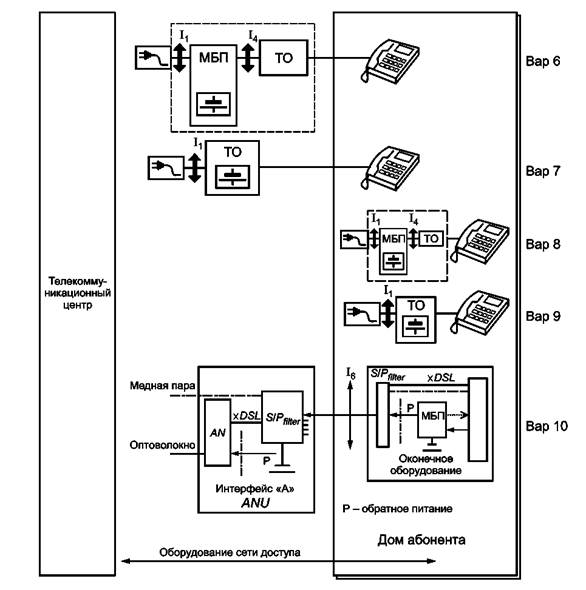 - электроснабжение с резервной батареей может быть обеспечено местным блоком питания (Вар6 или Вар8 на рисунке 3). Телекоммуникационный оператор обеспечивает МБП и необходимые параметры интерфейса «МБП/ТО» (I4 на рисунке 3), определенные в 7.2 - 7.4;