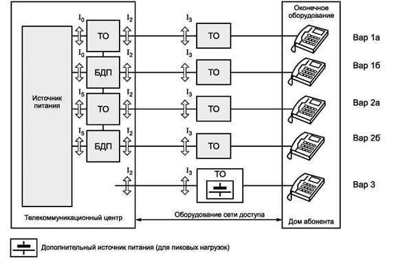 а) из-за металлической связи телекоммуникационного центра и сетевого оборудования доступа может использоваться централизованное питание (Вар1а/Вар1b и Вар2а/Вар2b на рисунке 1): удаленный источник энергии с резервной батареей в центральном офисе и устройства местного питания используют существующие медные пары. Такое решение возможно, если расход энергии оборудованием не слишком высок. Выходное напряжение источника энергии определено в 8.2;