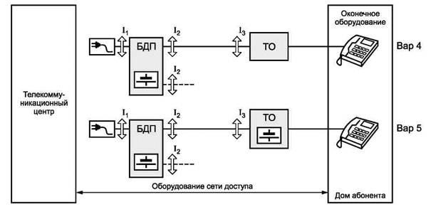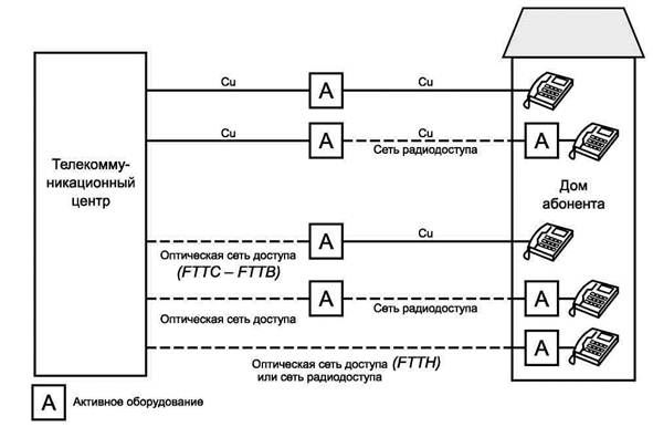 - Группа 2: ТО соединяется с телекоммуникационным центром неметаллическими линиями. Эта группа включает оптоволоконную сеть доступа (FTTH), гибридную сеть доступа оптоволокно/медь (FTTCab/FTTC/FTTB), гибридную сеть доступа медь/радиодоступ и сеть радиодоступа.