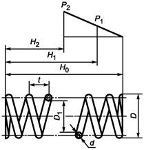 3.2 В КД указывают марку стали, размеры пружины и нагрузки, возникающие при ее сжатии, в соответствии с рисунком 1: