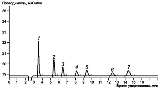 Рисунок 1 - Типовая хроматограмма ионов раствора, содержащая 1 мг/дм3 различных анионов в воде