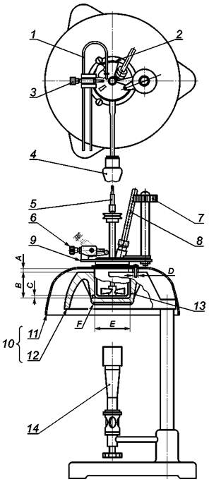 Аппарат состоит из испытательного тигля, испытательной крышки с заслонкой, устройства для перемешивания, источника нагревания, источника зажигания, воздушной бани и верхней плиты, подробное описание которых приведено в приложении A1. Ручной аппарат в сборе, испытательный тигель, крышка испытательного тигля и тигель в сборе соответствующих размеров приведены на рисунках А1.1 - А1.4.