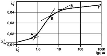 Точки перехода от одного этапа консолидации к другому определяют следующим образом. Проводят биссектрисы углов, образующихся при проведении касательных к прямолинейным и криволинейным участкам консолидационной кривой l = f(lgt). Пересечения биссектрис с кривой консолидации и будут точками перехода одного этапа консолидации в другой. В качестве примера на графике (см. рисунок К.2) показаны точки А, Б, В, Г, полученные на консолидационной кривой, отражающей четыре этапа консолидации. Окончание вторичной фильтрационной консолидации (или первичной, если нет вторичной) соответствует точке устойчивого выхода консолидационной кривой на прямолинейный участок. На рисунке К.2 этой точке соответствует точка В.