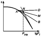 Находят точку А - точку резкого изменения кривизны (перегиба) кривой ei = f(lgPi). Через эту точку проводят касательную АВ и горизонтальную линию AD, затем биссектрису AM угла BAD. Прямолинейный участок компрессионной кривой экстраполируют до пересечения с биссектрисой АМ и получают точку N. Значение Р, соответствующее этой точке, принимают за структурную прочность грунта на сжатие Рстр.
