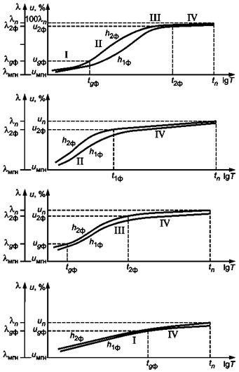h1ф - двухсторонняя фильтрация; h2ф - односторонняя фильтрация; l - относительная деформация, (см. ось и); иgф, u1ф, u2ф, uп - степень консолидации на момент завершения tgф, t1ф, t2ф, tп - дофильтрационной консолидации, первичной фильтрационной консолидации, вторичной фильтрационной консолидации и консолидации объемной ползучести соответственно