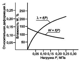 Рисунок Ж.1 - Зависимость относительной деформации и влажности грунта от нагрузки