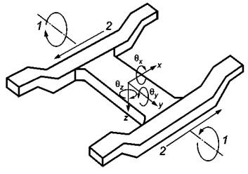 Направление циклов квазистатических нагрузок обычно меняют после каждых 10 - 20 динамических циклов, а число этих циклов должно быть пропорционально меньше числа циклов, указанного на рисунке Ж.1. Нагрузочный цикл при скручивании состоит из нагрузок на первичном подвешивании со скручиванием при +θу, затем при -θу по всей раме тележки с последовательной сменой знаков квазистатических нагрузок.