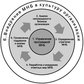 Рисунок 3 может быть представлен в виде колеса МНБ. Центр колеса (управление программой МНБ) и шина (внедрение МНБ в культуру организации) являются элементами, связанными с элементами «планирование, проверка и действие» в цикле PDCA. Спицы колеса (анализ непрерывности бизнеса организации, определение стратегии МНБ, разработка и внедрение ответных мер МНБ, применение, поддержка и анализ МНБ) относятся к элементу цикла PDCA «осуществление».