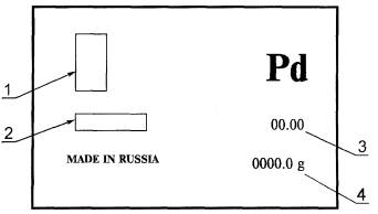 1 - товарный знак предприятия-изготовителя; 2 - номер (шифр) слитка; 3 - массовая доля палладия, %; 4 - масса слитка, g