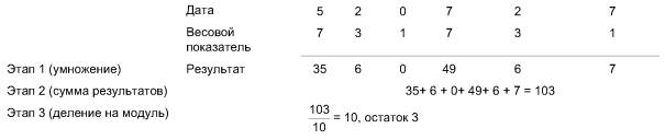 Этап 4. Контрольная цифра равна остатку 3. Дату и контрольную цифру соответственно записывают как 5207273