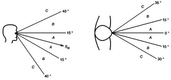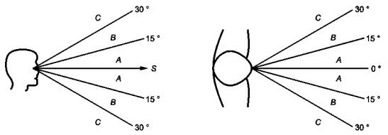 А - рекомендуемая зона; В - допустимая зона; С - неприемлемая зона; S - линия взгляда