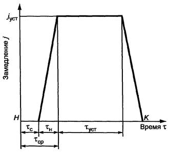 τс - время запаздывания тормозной системы; τн - время нарастания замедления; τуст - время торможения с установившимся замедлением; τср - время срабатывания тормозной системы; jуст - установившееся замедление АТС; H и K - начало и конец торможения, соответственно