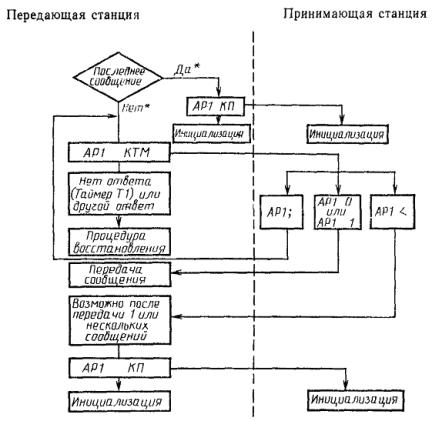 Принимающая станция инициализирует выдержку времени (равную удвоенному времени передачи блока) при получении ею управляющей последовательности AP1 HT. Если за это время не приходит управляющая последовательность AP1 KT, то принимающая станция не передает подтверждения и ждет приема.