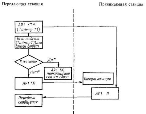 Передающая станция инициализирует выдержку времени Т1 (Т1 < Т2) передачей AP1 КТМ или ПП. Если в течение этого времени получен ответ от принимающей станции, то может быть осуществлено повторение последней передачи, повторение производится максимум четыре раза.
