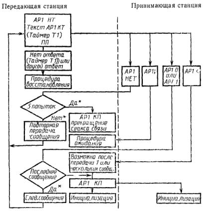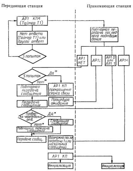 Принимающая станция активизирует выдержку времени Т2 (Т1 < Т2) передачей любого из подтверждений AP1 0, AP1 1, АР1 < или AP1 НЕТ. Если в течение этого времени не получена правильная передача от передающей станции (блок, заканчивающийся символами ПП, AP1 КТМ или AP1 КП), то принимающая станция возвращается в нейтральное состояние.