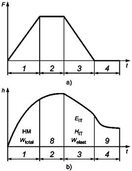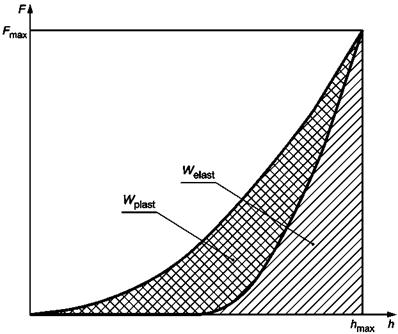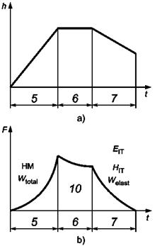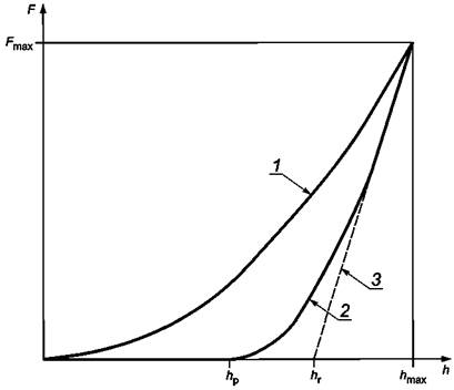 - косвенно, наблюдая отклонения от твердости, вычисленные с помощью измеренной испытательной нагрузки и соответствующей глубины индентирования (с твердостью, независимой от глубины индентирования). Этот метод нуждается в специальных контрольных материалах (например, кварцевом стекле, стекле ВК7) и применим для определения твердости индентирования НIT, а также твердости по Мартенсу (косвенно, путем использования индентирования в материал с известным модулем Юнга, (см. [15]). Если этот метод используется для определения твердости по шкалам Мартенса, функцию площади поверхности наконечника можно вычислить из кривой возрастания нагрузки на F-h-диаграмме.