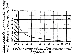 2.6. Применение лакокрасочных материалов с содержанием в них свинцовых пигментов допускается в количестве до одного процента при окраске изделий методами ручного распыления, а с более высоким содержанием свинца - при условии обеспечения в воздухе рабочих помещений до предельно допустимой концентрации красочной пыли в количестве, соответствующем данным рис. 1, но не более 5,0 мг/м3.
