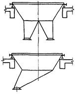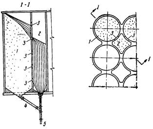 2.7. При проектировании силосов следует применять мероприятия, направленные к снижению горизонтальных давлений, возникающих при выпуске сыпучих материалов, например путем выпуска зерна из силосов через смежные звездочки (рис. 4).