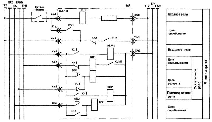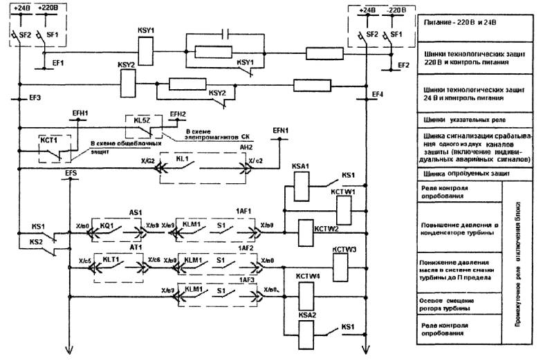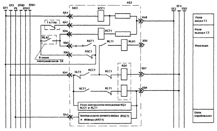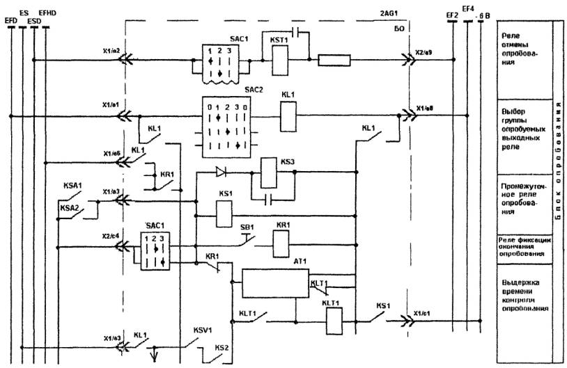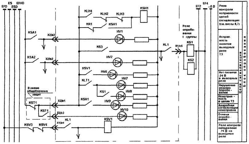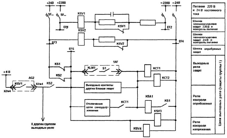 При этом контактом реле KS1 отключается напряжение 24 В постоянного тока с шинки EFS питания выходных реле защит. После подтверждения обесточения шинки EFS на нее подается пониженное напряжение 6 В постоянного тока контактом реле KSV1, которое другим контактом подает напряжение 24 В с шинки EF3 на шинку ES опробования ТЗ данной группы.