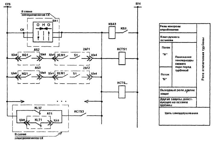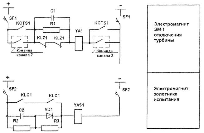 При отказе электромагнита YА1 срабатывает реле КТ1, подается сигнал "Неисправность электромагнита отключения турбины" и контактами реле KLZ1 снимается напряжение с YА1.