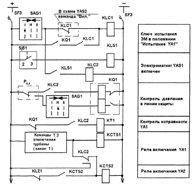 При успешном включении YА1 уменьшается давление в линии защиты, в результате чего включается реле KQ1 и появляется сигнал "Снижение давления в линии защиты при испытании", одновременно подается команда на реле KLZ1, снимающее напряжение с электромагнита YА1, а также включается цепь самоудерживания реле KLC1.