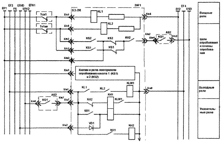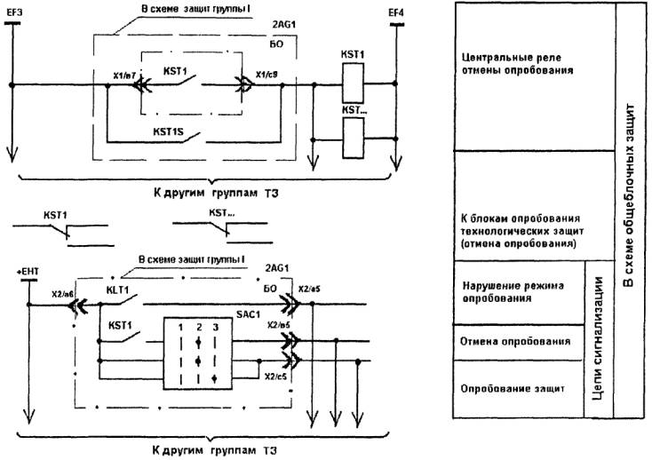 Если ТЗ, реализованные в одном шкафу, имеют разные автоматы питания, они разбиваются на группы, каждая из которых опробуется отдельно. В каждую группу может входить до пяти групп параллельно включенных выходных реле, реализующих одну программу действия. Параллельно каждой группе выходных реле ТЗ подключается выходное реле опробования КS. Если схема ТЗ имеет больше пяти программ действия, организуется несколько, но не более трех групп опробования, например, для схемы ТЗ турбины организуется группа собственно ТЗ турбины и группа технологических ТЗ генератора.