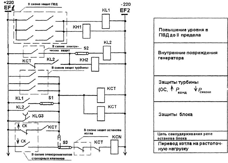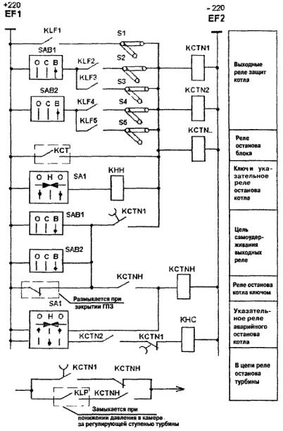 Для повышения надежности схемы отмены опробования команда на включение этих реле подается не только от указательного реле сработавшей ТЗ через реле отмены опробования (KST) в соответствующем БО, но и от выходных реле, на которые подает команду сработавшая ТЗ. Кроме того, центральные реле отмены опробования включаются при ручном останове котла или турбины.