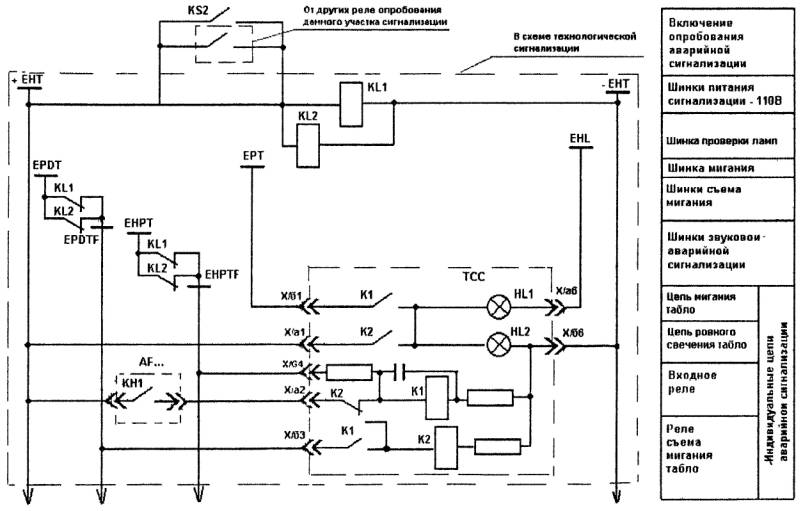 На рис. 24 (лист 6) показано подключение одного табло типа ТСС-66М к аппаратуре в БО. В схеме сигнализации должны быть предусмотрены реле KL1 и KL2, которые в режиме опробования отключают шинку съема мигания EPDT и шинку звуковой аварийной сигнализации ЕНРТ. При опробовании ТЗ ее указательное реле КН1 подает напряжение на шинку ЕНРТF и в БО срабатывает реле KLH2. После срабатывания реле К1 в табло его лампы подключаются к шинке мигания. Размыкающим контактом реле KLH2 отключается реле KLH3, после чего включается реле KLH1, которое подает напряжение на шинку EPDTF. Вследствие этого срабатывает реле К2 в табло, переводит лампы на ровное свечение и отключает реле К1, что вызывает отключение реле KLH2. Отключенное состояние KLH2 при включенном KLH1 свидетельствует об исправности аппаратуры табло, что и фиксируется реле контроля исправности цепей сигнализации КSН1 в БО.