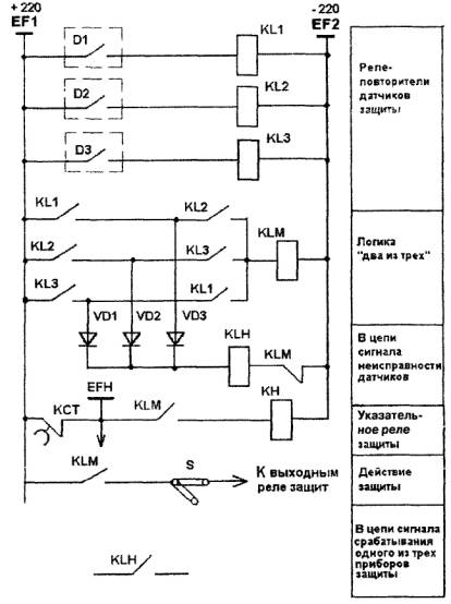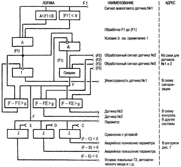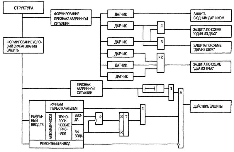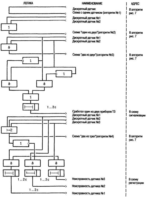 Количество резервирующих друг друга датчиков и схема резервирования определяются требуемой надежностью схемы ТЗ и надежностью используемых датчиков (вероятностью их несрабатывания или ложного срабатывания). Применяются схемы: с одним датчиком, "один из двух", "два из двух" и "два из трех". На рис. 2 даны варианты формирования признака аварийной ситуации при применении датчиков дискретного сигнала.