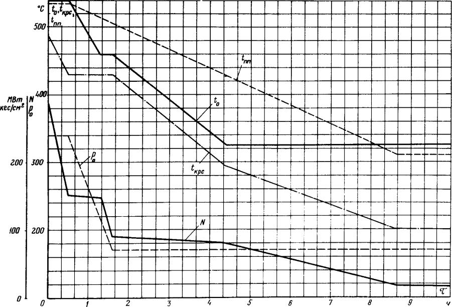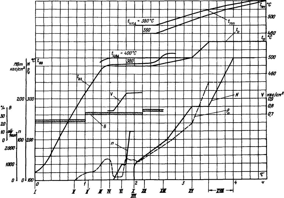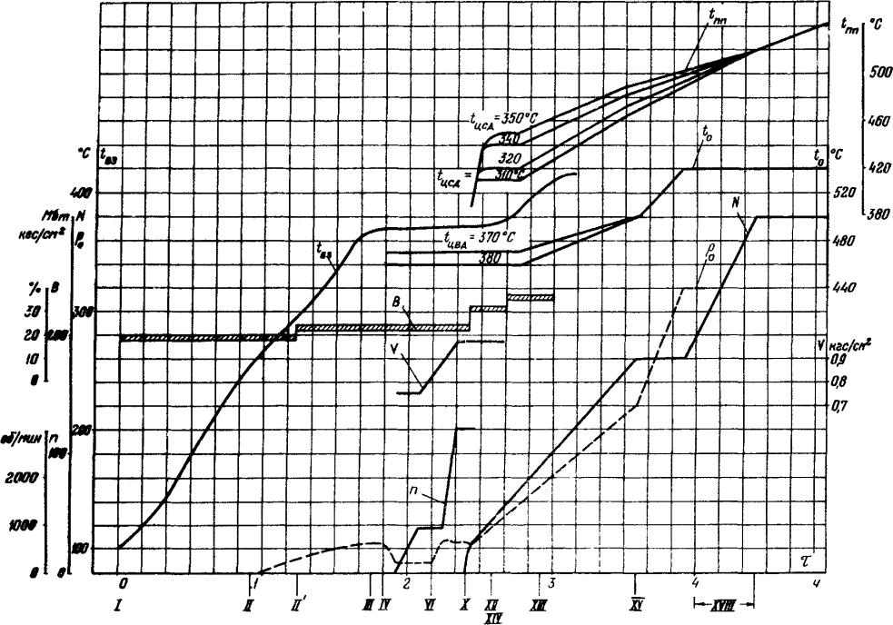 1.12. В графиках-заданиях пуска блока указаны диапазоны начальных температур ЦВД и ЦСД турбины в зоне паровпусков, в пределах которого должен реализоваться заданный график нагружения, и сетка кривых изменения температуры свежего пара (за пусковым впрыском) и пара промперегрева (перед ЦСД турбины).
