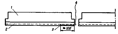 4.3. Термопары следует устанавливать у края обмуровочной плиты на огневой поверхности бетона, как показано на рис. 5. Рабочие концы и отрезок термопары длиной не менее 100 мм укладываются в канавку глубиной 4 - 5 мм, проделанную в бетоне, и затираются бетонной массой заподлицо с плитой. Свободные концы термопар при установке плиты на котел выводятся на холодную сторону обмуровки через монтажные стыки между плитами.