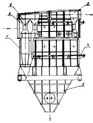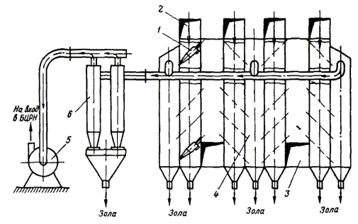 1 - циклонный элемент; 2 - камера газов, поступающий на очистку; 3 - камера очищенных газов; 4 - золовая камера; 5 - дымосос рециркуляции; 6 - отсосные циклоны