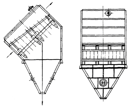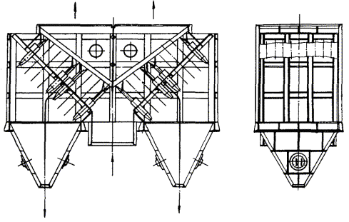 Рис. 3. Батарейный циклон с установкой циклонных элементов под углом 45° и восходящим движением газов