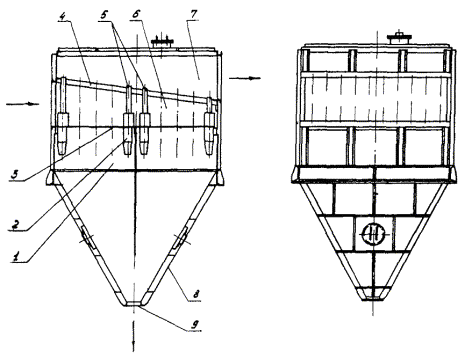 Трубные доски делят корпус на три камеры, которые сообщаются между собой только через циклонные элементы. Средняя камера неочищенного газа 6 предназначена для распределения по циклонным элементам неочищенного газа. В этой камере размещены входные патрубки циклонных элементов. Верхняя часть корпуса является камерой очищенного газа 7, в которую из выхлопных труб циклонных элементов поступают очищенные газы. Нижняя часть корпуса представляет собой общий для всех элементов золовой бункер 8. Из течки 9, имеющейся в нижней части бункера, уловленная зола поступает в систему золоудаления.