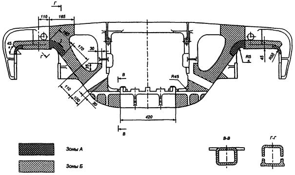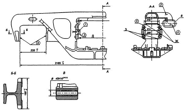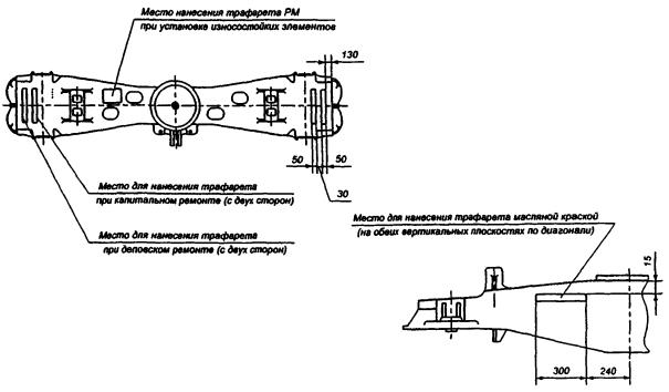 Примечание. Порядок выполнения измерений изложен в технических условиях на изготовление шаблонов, а также в руководящем документе: «Методика выполнения измерений надрессорной балки, боковых рам, пружин и рессорного комплекта при проведении плановых видов ремонта тележек 18-100» РД 32 ЦВ 050-2005.