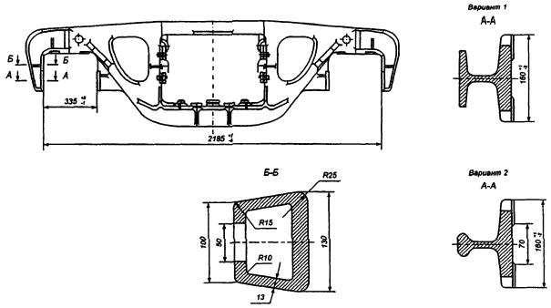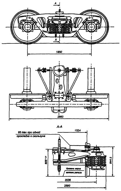 - рама тележки, состоящая из двух боковых рам и надрессорной балки со скользунами;