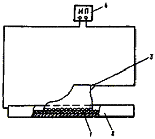 Сопротивление постоянному току кожаной и резиновой экранирующей спецобуви должно измеряться мегаомметром 4 (см. рисунок) на напряжение 500 или 1000 В. Определяется сопротивление между контактным выводом 3 и металлической ванной 2, в которую необходимо помещать каждую полупару. Под спецобувь подкладывается два-три слоя хлопчатобумажной ткани 1, обильно смоченной 1,5 %-ным водным раствором поваренной соли (15 г на 1 л воды). Значение сопротивления должно быть не более 10 кОм. Экранирующая спецобувь, не удовлетворяющая этому требованию, должна быть изъята из эксплуатации и заменена новой.