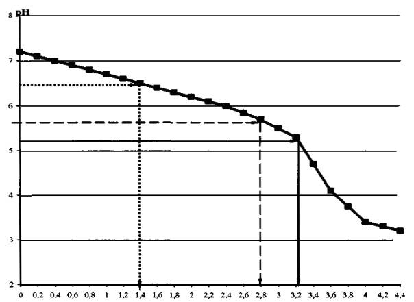 Большим преимуществом предлагаемого метода является то, что на этой же кривой можно легко определить буферную емкость водного объекта для случая, когда жестко заданы предельные значения рН. Например - буферную емкость, при превышении которой водные объекты переходят в разряд кислых (рН < 5,0) или к превышению ПДК питьевой воды по рН (рН < 5,5). В этом случае из заданного значения рН на оси ординат восстанавливается перпендикуляр до пересечения с кривой титрования и от точки пересечения опускается перпендикуляр до пересечения с осью абсцисс, в точке пересечения с осью абсцисс и снимаются значения буферной емкости.