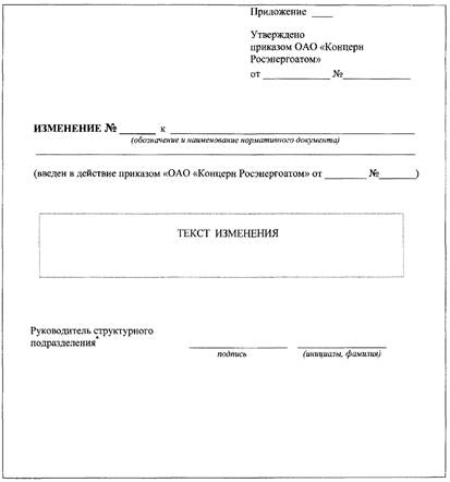 6.3.1 Изменение к НД утверждается приказом Концерна либо личной подписью руководителя (Генерального директора Концерна, лица, замещающего его в установленном порядке, либо его заместителем по направлению деятельности в соответствии с [1]).