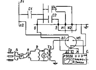 Выводы НД" и "Э" моста соединены с выводом испытательного трансформатора Тр, выводы "И1", "И2",... заземлены, выводы "ЛГ, "Л2" ТТ разземлены |
