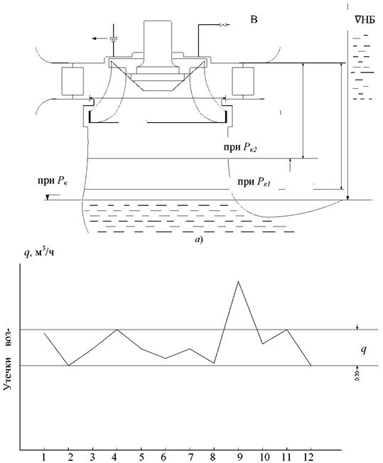 При этом считается, что процесс утечки воздуха должен происходить при неизменной температуре. Сравнивая утечки на отдельных гидроагрегатах, можно определить на каком из них ухудшается состояние уплотнения направляющего аппарата. Для этого на рисунок Ш.1, б) наносится зона нормальных утечек qнорм, значения которых определяются при наладке системы СК.